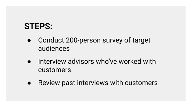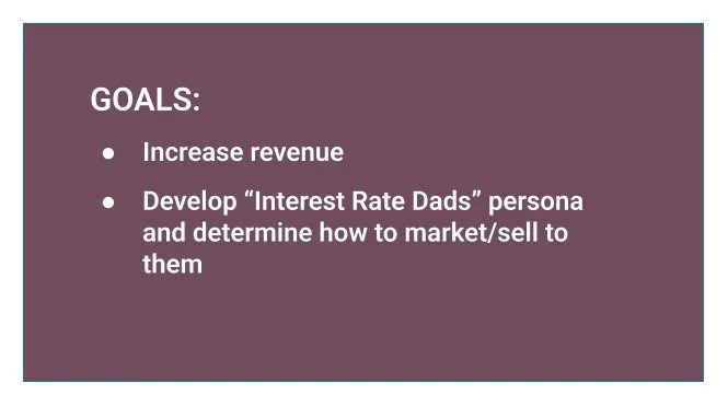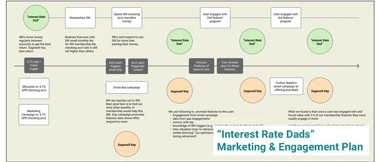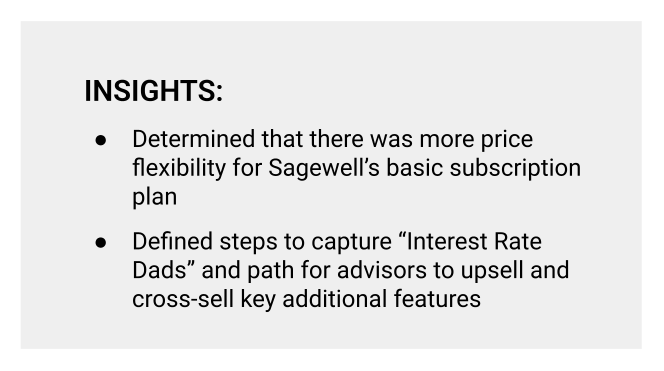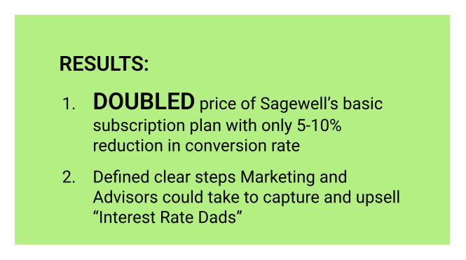 Sagewell Financial was a fintech startup focused on optimizing people’s spend-down during retirement. Via research, I identified the ability to double the price of Sagewell’s core services with only 5-10% decrease in conversions. I further defined the “Interest Rate Dad” persona and created a customer engagement journey for sales and marketing.