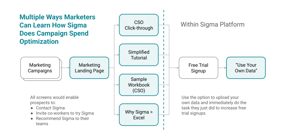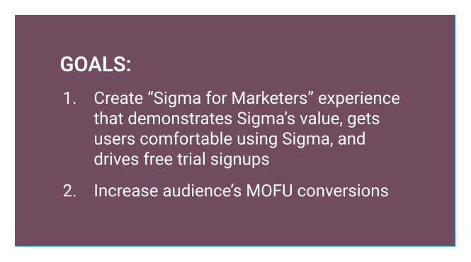 SIGMA COMPUTING is a start-up cloud-native business analytics platform for business users. I led the creation of a try-it-yourself “Sigma For Marketers” flow that created 5X free trial signups and increased MOFU conversions.